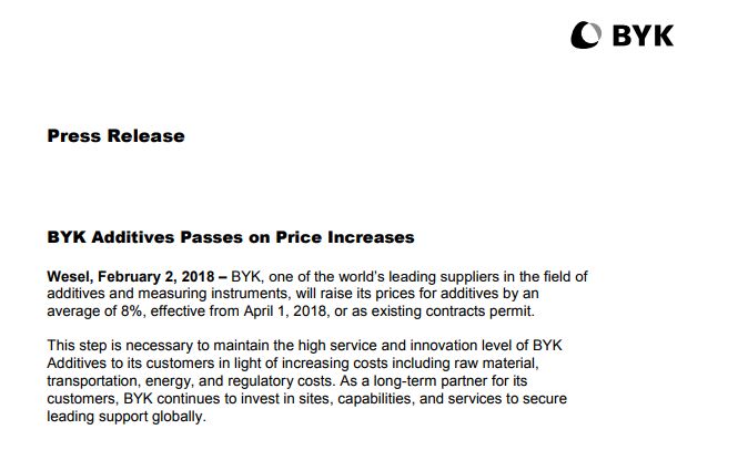 作为世界上添加剂和测量仪行业中的领头羊之一的毕克化学,宣布从2018年4月1日起,或合同允许情况下,将其添加剂价格平均上调8%左右。