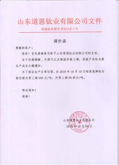 据悉,山东道恩钛业发布调价函,宣布由于近期硫酸、天然气及物流价格上调,钛白粉生产成本大幅增加,该公司钛白粉自2018年10月10日起内贸上调300元/吨,外贸上调50美元/吨。