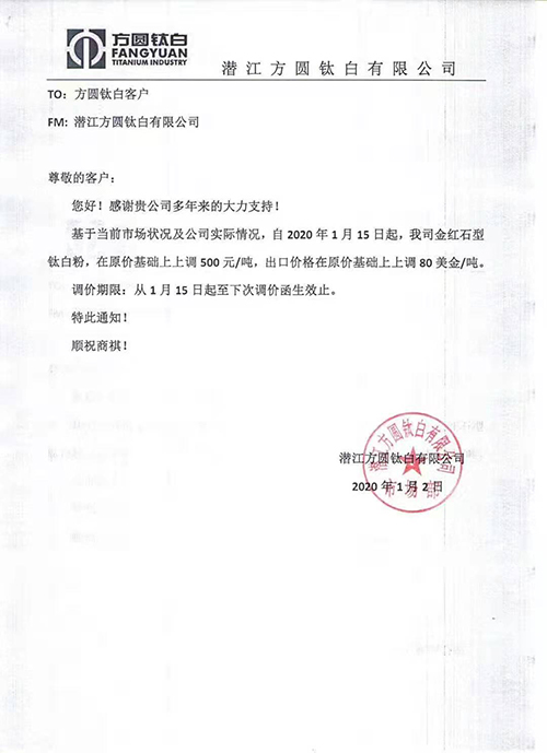 潜江方圆和天原集团宣布上调钛白粉价格