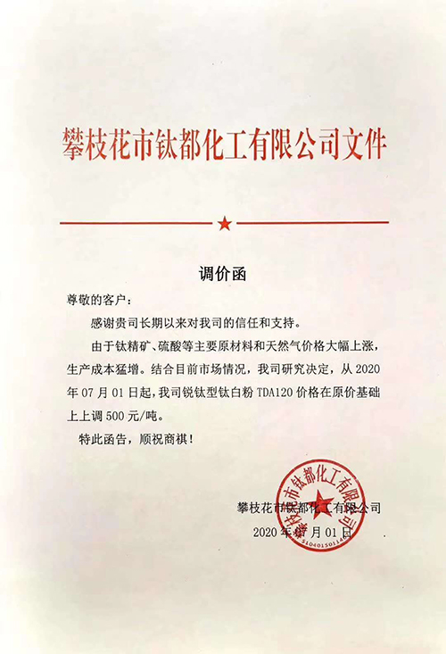 由于钛精矿、硫酸等主要原材料和天然气价格大幅上涨,生产成本猛增。从2020年7月1日起,锐钛型钛白粉TDA120在原价基础上上调500元/吨。详情见下图: