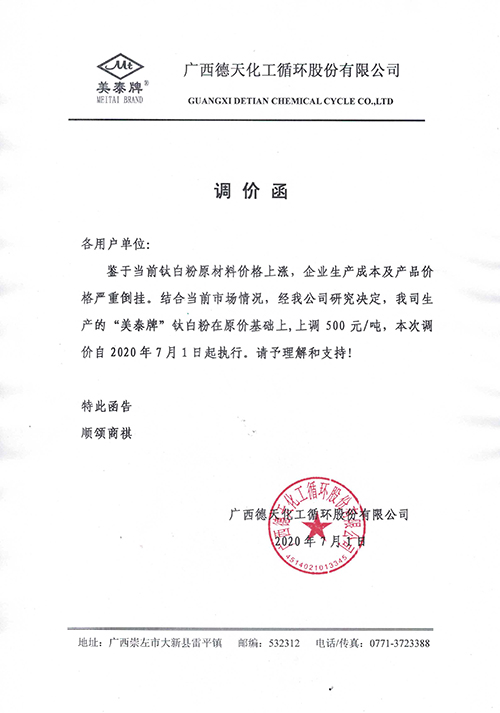 鉴于当前钛白粉原材料价格上涨,企业生产成本及产品价格严重倒挂,生产的“美泰牌”钛白粉在原价基础上,上调500元/吨,本次调价自2020年7月1日起执行。详情见下图: