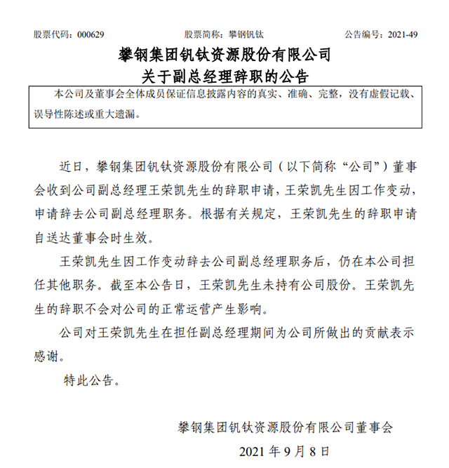 9月7日,攀钢钒钛(000629)董事会收到公司副总经理王荣凯的辞职申请,王荣凯因工作变动,申请辞去公司副总经理职务。根据有关规定,王荣凯的辞职申请自送达董事会时生效。