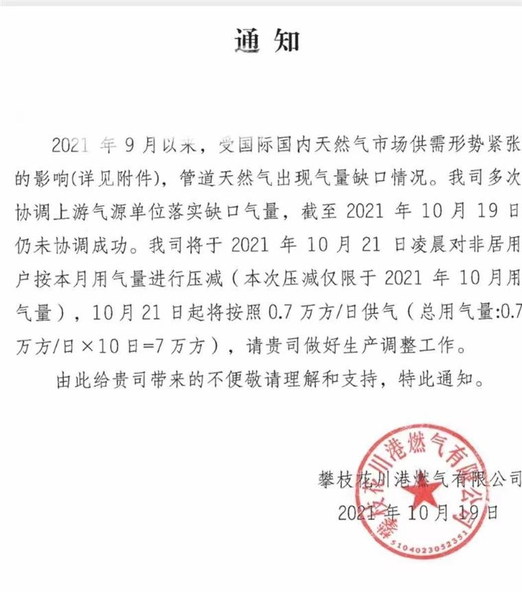 近期攀枝花地区受国际国内天然气市场供需形势紧张影响,自2021年10月21日起对非居户进行压减10月用气量,至使攀枝花地区部分钛企业生产受到影响,各家生产情况不同,至使影响情况不一。
