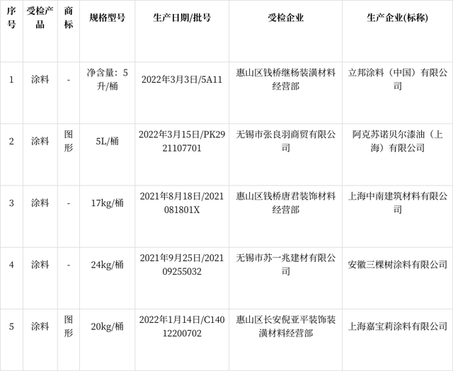 2022年惠山区涂料产品质量监督抽查合格产品: