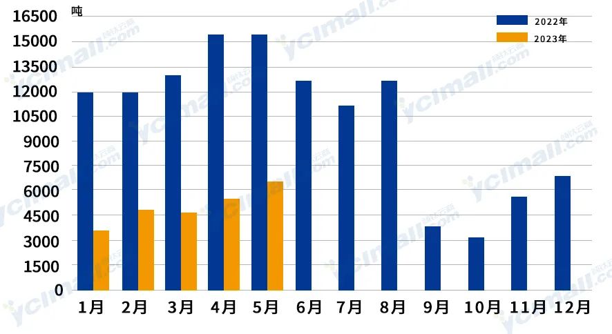 根据海关总署提供统计数据,2023年5月中国钛白粉进口量6443.75吨,环比增长16.24%,同比2022年同期下滑56.92%。2023年1-5月中国钛白粉进口累计约2.51万吨,较2022年同期减少约4.20万吨,减少62.53%。