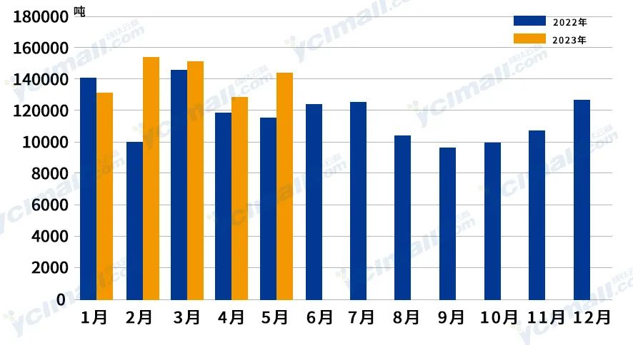 根据海关总署提供统计数据,2023年5月中国钛白粉出口量为14.46万吨,环比增长12.26%,同比2022年同期增长25.07%。2023年1-5月钛白粉累计出口约71.06万吨,同比2022年同期增加约8.84万吨,增长14.20%。