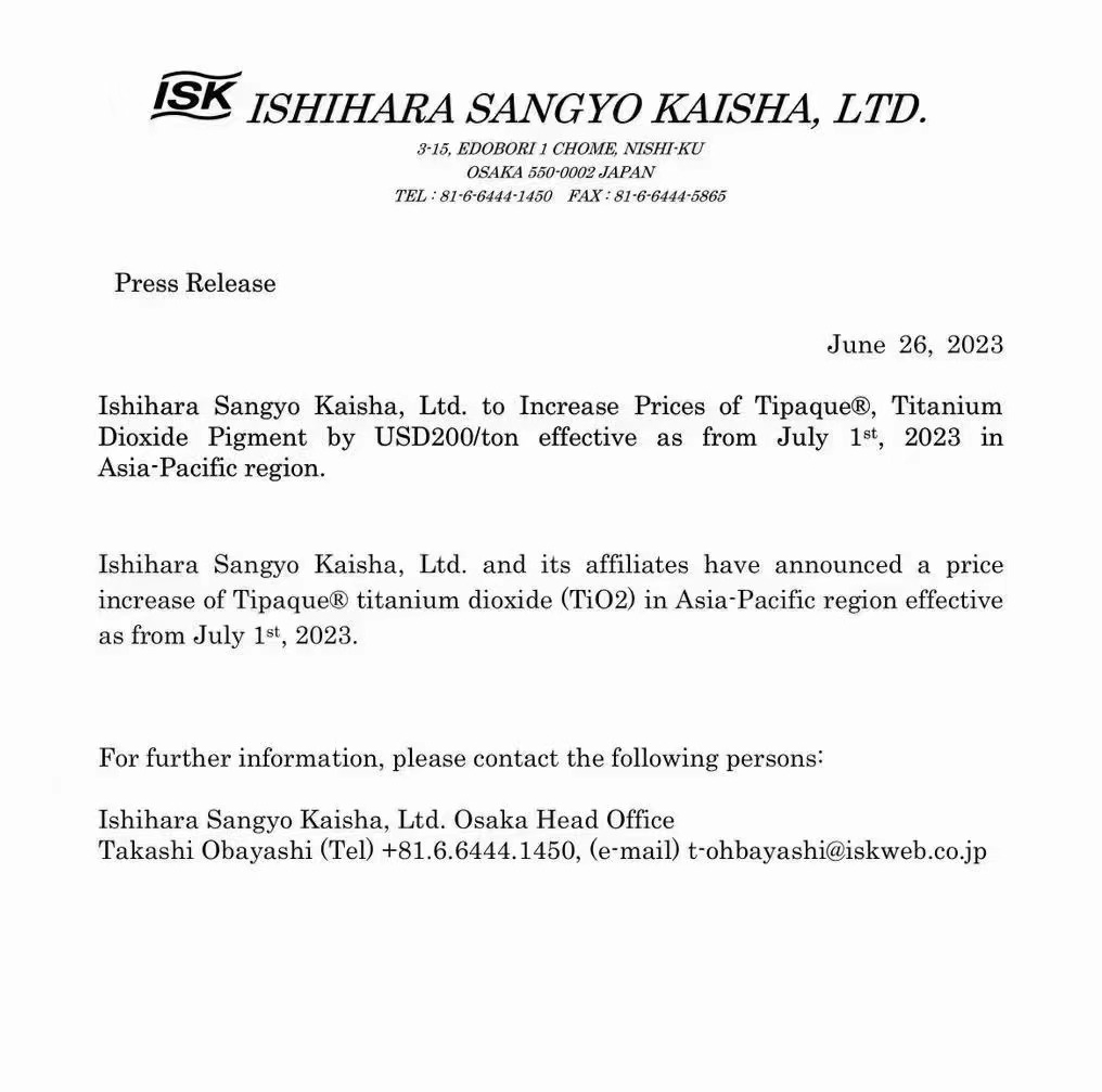 2023年6月26日,日本石原宣布:自2023年7月1日起,上调亚太地区销售的二氧化钛(钛白粉)价格200美元/吨。